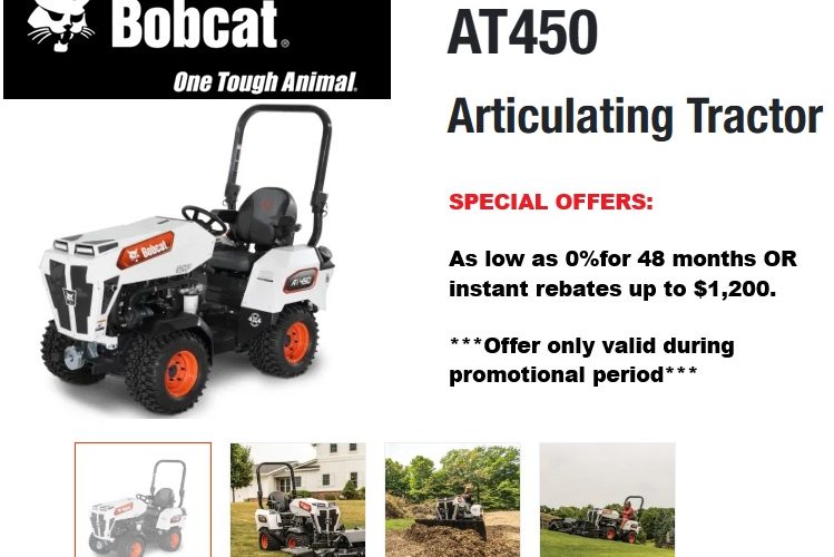 Customers can take advantage of up to $1,200 End User instant rebate when purchasing a NEW Bobcat AT450 tractor and $250 per attachment when purchasing 3 or more!! Only valid…